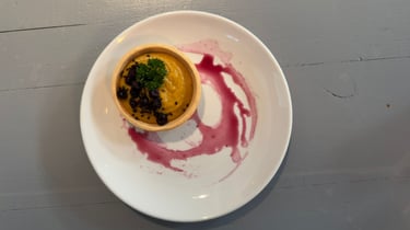The evening began with "I'm Not What You Think," a visually deceptive tart made of pumpkin and mushroom cream, garnished with blueberries and roasted sesame seeds. Its dessert-like appearance challenged first impressions, setting the tone for a night of surprises. This dish encouraged guests to approach life—and each other—with curiosity and an openness to discovery.